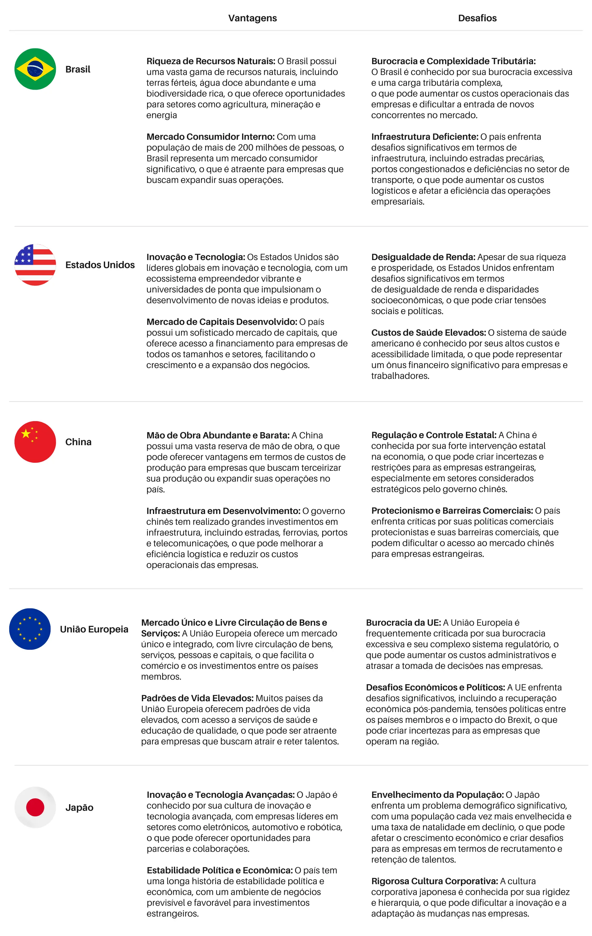 Para prosperar, as empresas devembuscar estratégias que aproveitem as vantagens competitivas de cada país, ao mesmo tempo que enfrentam e mitigam os desafios específicos do ambiente de negócios em que operam.