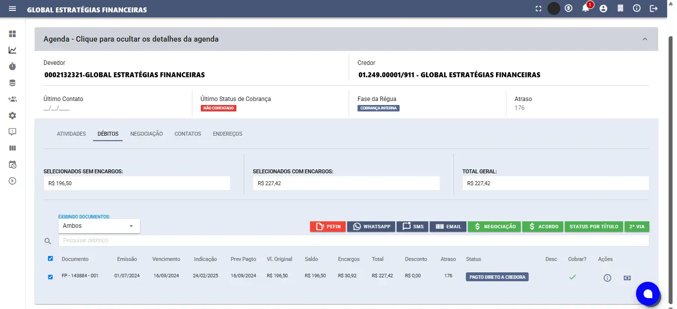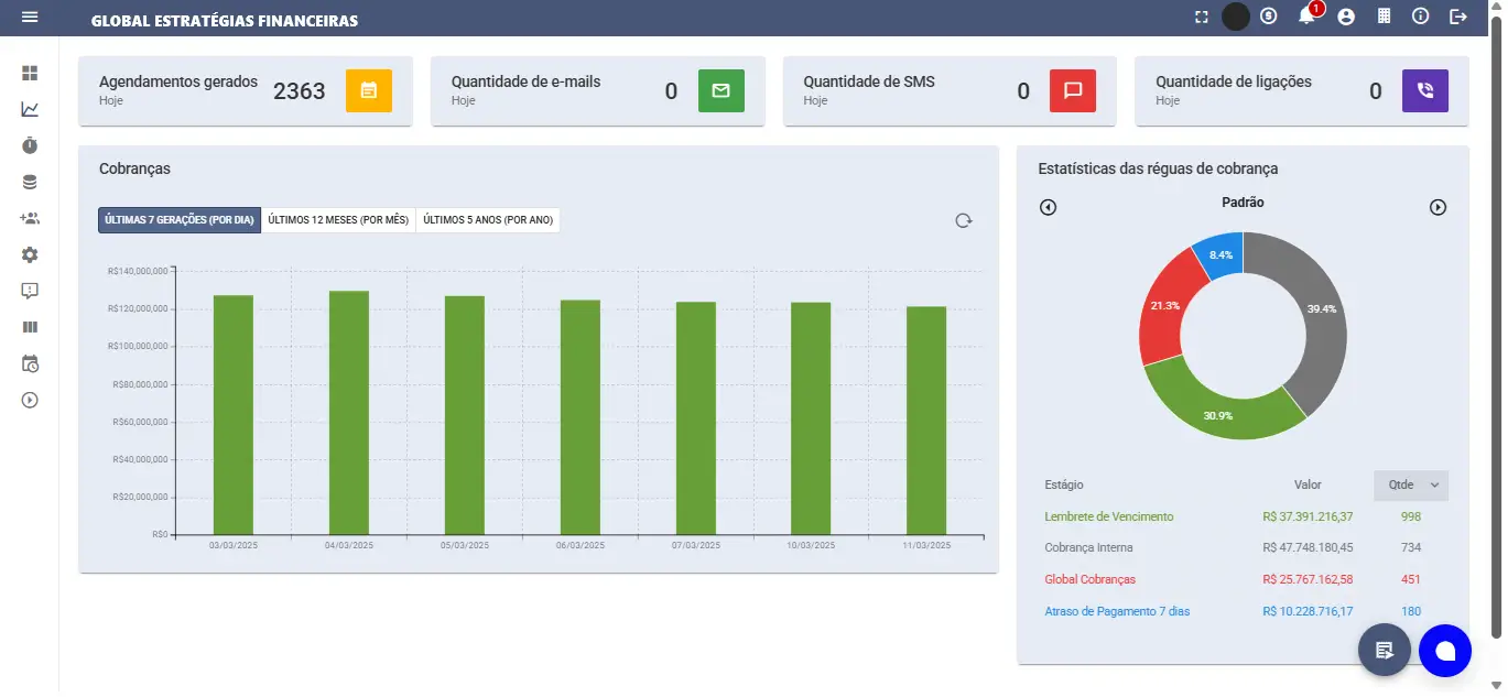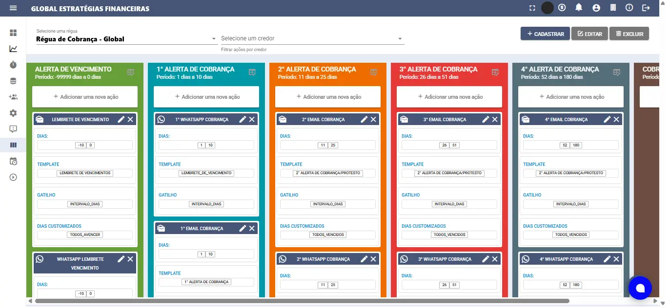 Unifique canais, personalize fluxos e ative ações automáticas em grande escala. Tudo isso com uma régua de cobrança sob medida para a sua operação e integração nativa com a cobrança terceirizada da Global.