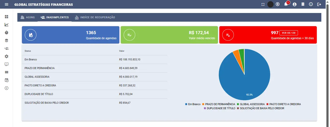 Acompanhe gráficos em tempo real, visualize inadimplência por carteira, acione clientes conforme dias de atraso e compare performances.